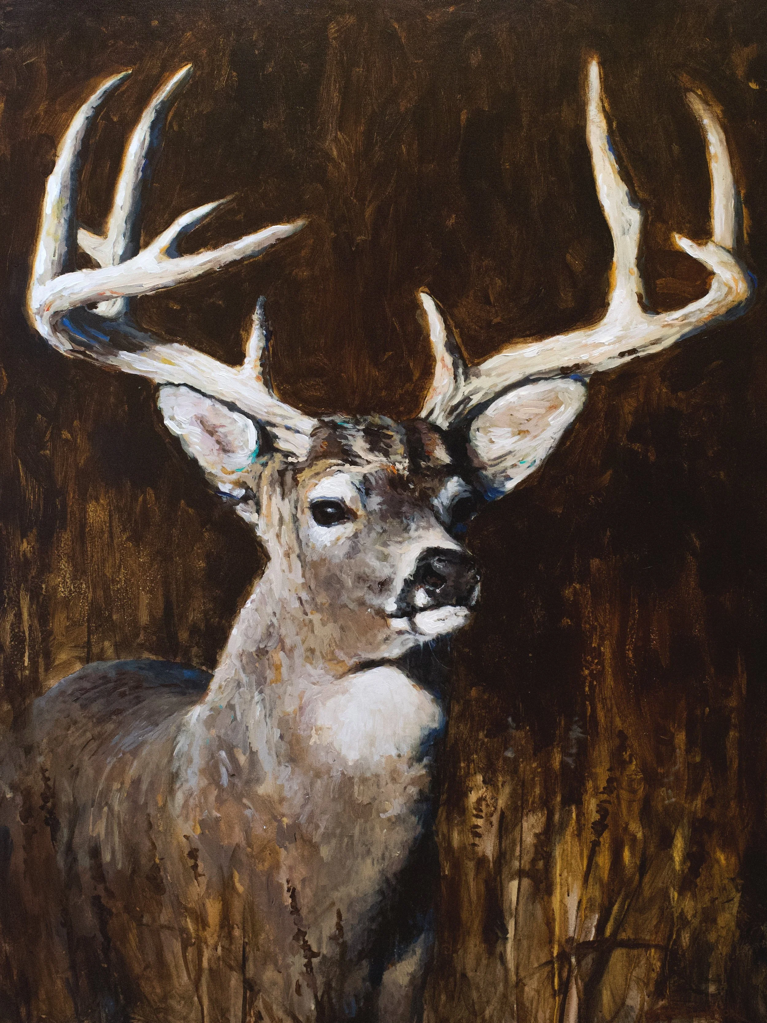 My inspiration is pulled from natural scenes and then interpreted through art with unnatural color. A whitetail deer in its prime has no ultramarine blues or crimsons in its hide. I believe the only possible way to recreate such an animal as this is with immense color and contrast.